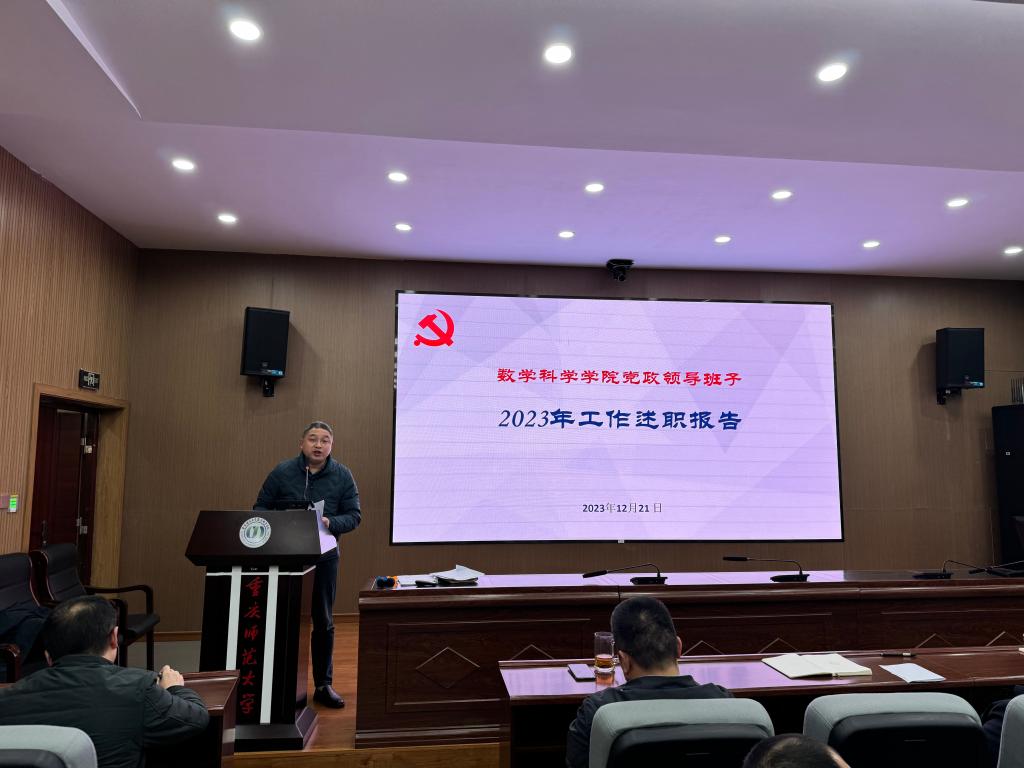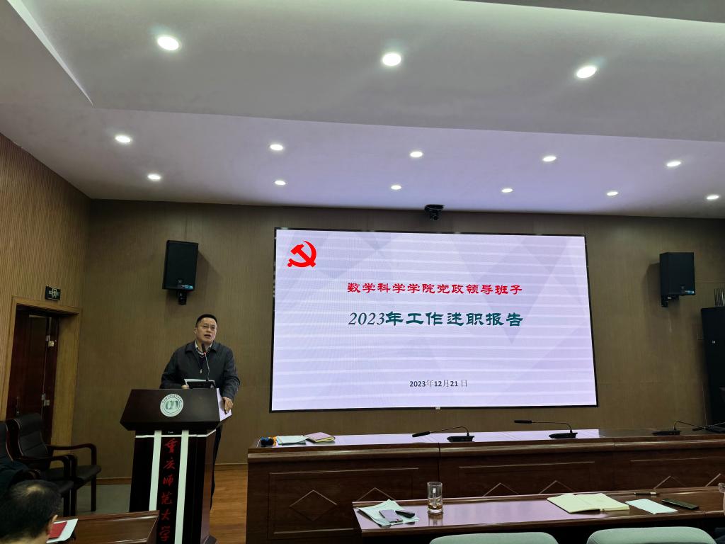 首先,杨江水书记代表领导班子述职。他从高起点谋划推进学院2023年工作、高标准完成主题教育活动、高水平推进学院事业发展、高强度破解学院发展难题、全方位推进70周年校庆筹备工作、多层面汇聚发展力量、科学规范有序开展制度理院七个方面介绍2023年度学院党政领导班子工作成效。接着,学院院长杨志春做个人述职。杨院长就分管的学科建设、人才与师资队伍建设、财务、资产等工作进行述职,梳理学院年度行政工作要点,落实事业发展重点任务与学科建设;积极推进国内合作与社会服务等六个方面详细梳理2023年度取得工作成绩。他讲到,学院取得的成绩,是全院教职工共同努力的结果。希望全体教职工再接再厉,争取更大的成果。学院党委副书记袁小于就分管的本科太阳集团、招生、纪检等工作进行述职。副院长赵克全就分管的本科教学、学科竞赛等工作方面进行述职。副院长张文萌就分管的科研、研究生工作等工作方面进行述职。最后,学院党委书记杨江水就个人分管的党的建设、意识形态、师德师风等工作进行了述职,他从努力把航导向,推动学院提质转型;强化政治建设,提升党建工作水平;坚持党管人才,多措推进队伍建设等九个方面介绍个人履职情况。