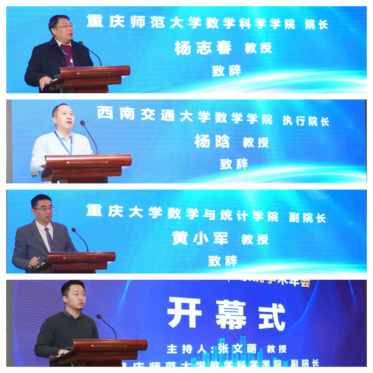 开幕式由太阳集团tcy8722副院长张文萌教授主持,太阳集团tcy8722院长杨志春教授、西南交通大学数学学院执行院长杨晗教授、重庆大学数学与统计学院副院长黄小军教授为大会致辞。