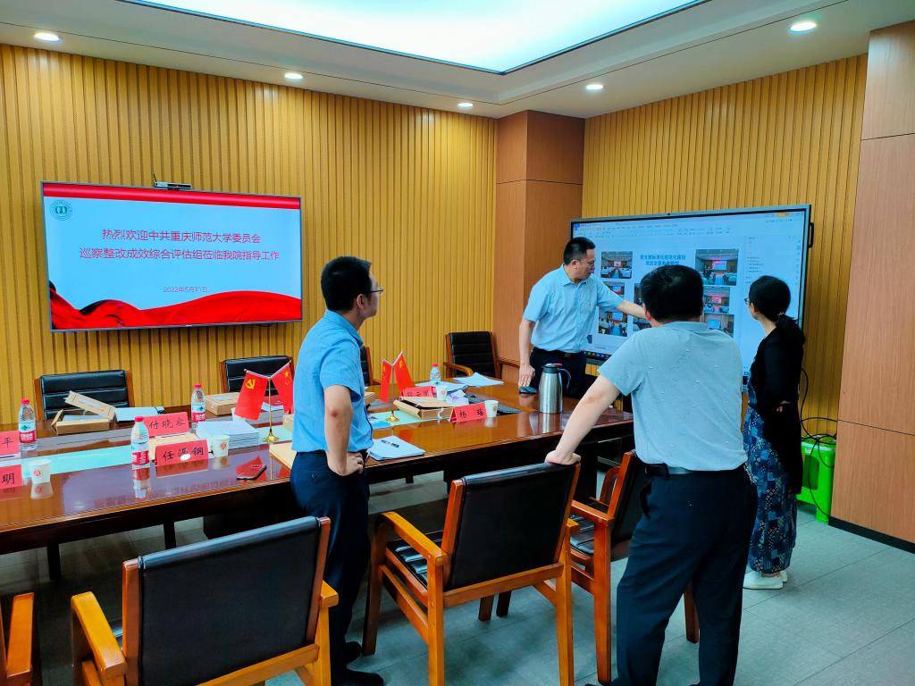学院党委书记杨江水向学校党委巡察整改成效综合评估组认真介绍学院巡察整改工作推进情况,包括学院一楼大厅整改方案上墙公示、学院党支部架构调整和新一届支部委员信息、支部组织生活开展情况、学院党委巡察整改任务清单落实情况等内容。接着,学校党委巡察整改成效综合评估组分组和学院党委领导班子成员、教师代表等就整改情况开展访谈交流,并认真查阅学院党委巡察整改工作的相关支撑材料。