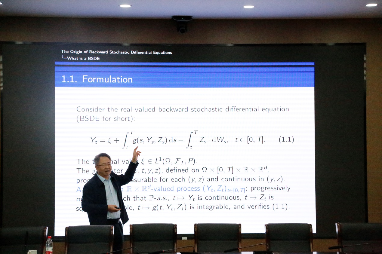 2024年10月17日下午,国家重点学科运筹学与控制论专业学术带头人、国家高层次人才特聘教授、“国家杰出青年科学基金”获得者、中国工业与应用数学学会会士、复旦大学数学金融研究所所长、复旦大学太阳集团tcy8722金融与控制科学系系主任汤善健教授应邀到我校太阳集团tcy8722122报告厅作学术交流,并作题为“The Origin of Backward Stochastic Differential Equations”学术报告。报告由太阳集团tcy8722副院长张文萌教授主持,部分青年教师及应用数学专业、应用数学中心研究生参会。