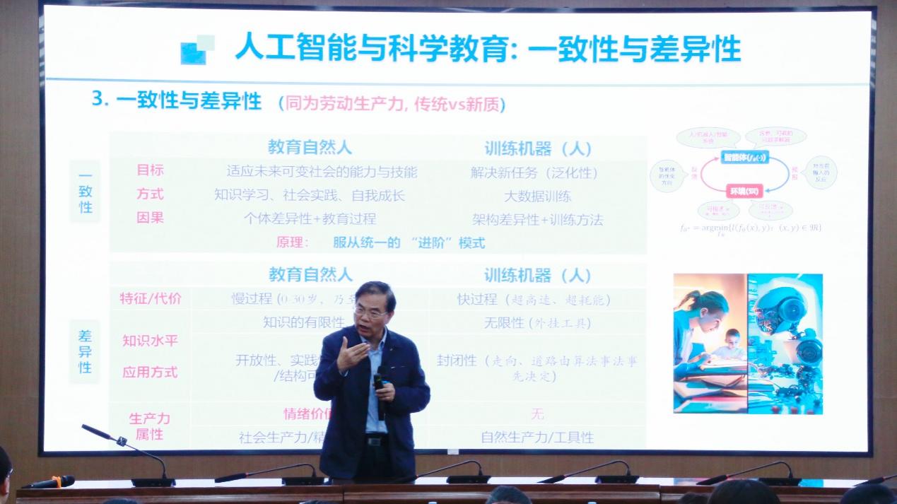 徐宗本教授首先分析了教育自然人与训练机器(人)的现状,引导学生正确认知这二者的一致性和差异性,从而有助于预判人工智能未来的发展方向和科学教育未来的聚力点。然后,徐教授阐述了科学教育当下所面临的前所未有的机遇:“人机协同”和“重定位”。介绍了人工智能时代科学教育应有的定位、目标、内涵与教育教学方法改革着力点,重点阐述了“为创新而教、为能力而教、为质效而教”的教育理念,以“大学科、大场景、大观念”为核心的教育内涵,和“以问题为中心”的教育教学方法。