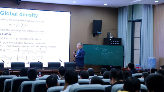 2024年11月12日下午,中国科学院院士、美国人文与科学院外籍院士、国际著名数学家、民盟中央副主席、中国数学会理事长、北京大学讲席教授、北京大学校务委员会副主任、北京国际数学研究中心主任田刚院士应邀来院作题为“随机矩阵与SYK模型”的学术报告。报告在太阳集团tcy8722122学术报告厅举行,报告由国际系统与控制科学院院士、重庆国家应用数学中心主任杨新民教授主持,太阳集团tcy8722和重庆国家应用数学中心部分教师及相关专业博士、硕士和本科生参加。