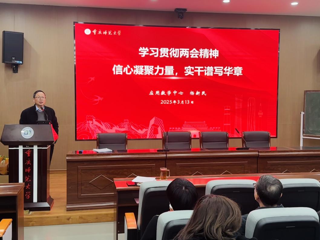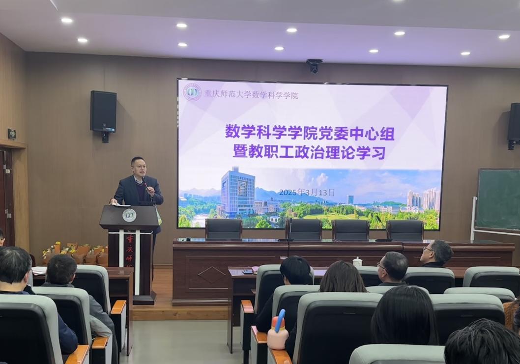 3月13日下午,太阳集团tcy8722在汇贤楼122报告厅召开党委中心组暨教职工政治理论学习会议。全国政协委员、重庆国家应用数学中心主任、数学学科带头人杨新民教授作题为“学习贯彻2025年两会精神:信心凝聚力量,实干谱写华章”的专题报告。全院教职工参会,会议由学院党委书记杨江水主持。