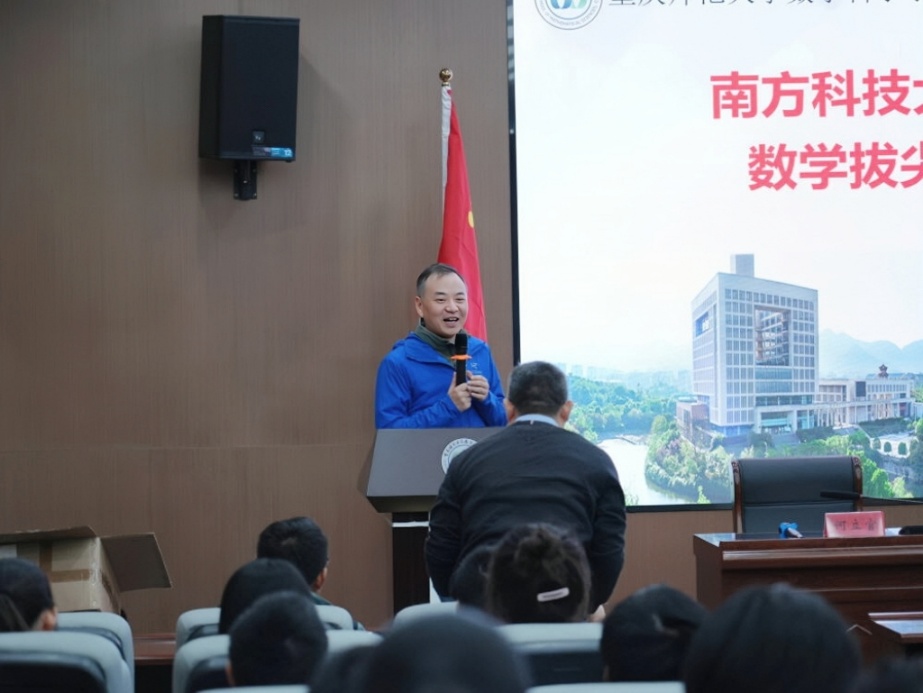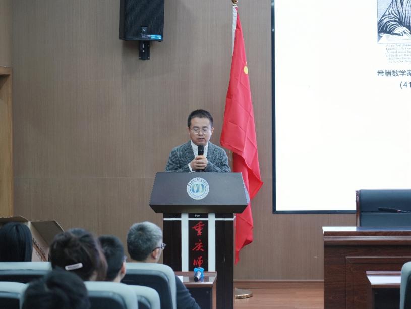 在主题报告环节,重庆国家应用数学中心杨凯龙副教授为在场师生作了一场内容丰富、深入浅出的科普报告。他以生动的语言介绍了当前数学研究的前沿动态,激发了在场师生对数学理论与应用探索的浓厚兴趣,营造了积极活跃的学术交流氛围。