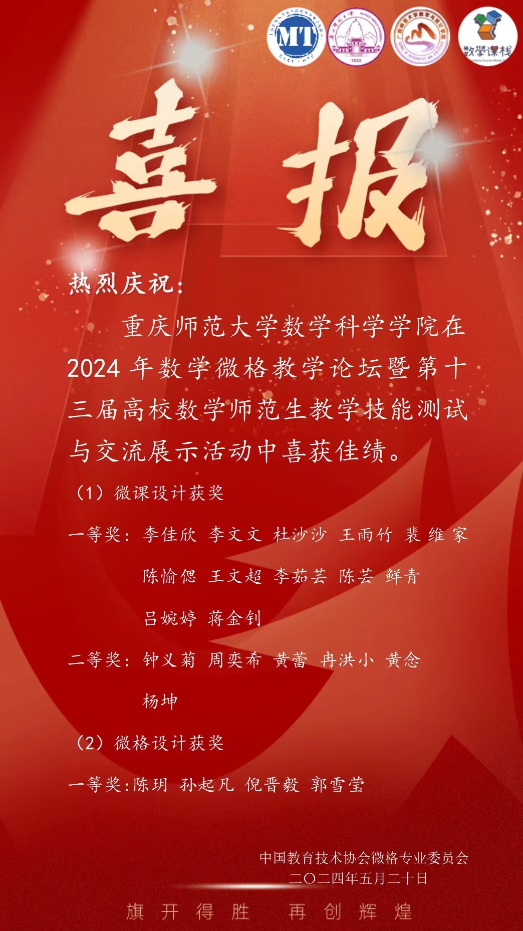 我院通过初赛、决赛选拔,在数学专业教师和一线中学数学教师协力精心指导下,派出4名学生参与微格教学技能能力测试,6组学生参与微课设计能力测试,取得优异成绩。其中,在微格教学技能能力测试中,学科教学(数学)专业硕士生郭雪莹、陈玥、孙起凡、倪晋毅获一等奖;在微课设计能力测试中,研究生组的李佳欣、李文文、杜沙沙、王雨竹、裴维家、陈愉偲、王文超、李茹芸、陈芸,本科生组的鲜青、吕婉婷、蒋金钊荣获一等奖;研究生组钟义菊、周奕希、黄蕾、冉洪小、黄念、杨坤获二等奖。