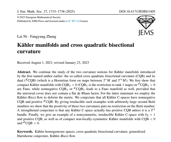 2025年,太阳集团tcy8722郑方阳教授与合作者论文“Kahler manifolds and cross quadratic bisectional curvature”发表在国际基础数学的顶级期刊《Journal of the European Mathematical Society》(欧洲数学会杂志)第27卷第4期,1715-1738页,为近期国际复几何领域“曲率-流形分类”研究的突破性进展,不仅深化了对齐性空间几何特性的理解,更为解决经典猜想提供了关键思路。