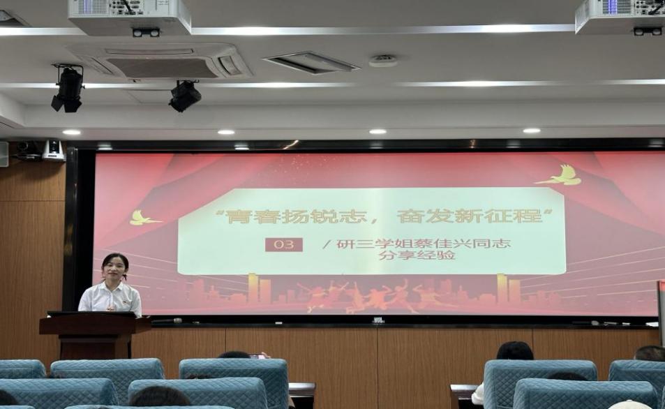 会议进行第三阶段,由研三学姐蔡佳兴同志分享学习经验。分享会上,蔡佳兴同志向各位同志分享了她的一些学习经验以及求职经验,包括她的研究生三年的学习规划以及学习方法,使2023级党员同志更加坚定自己的奋斗方向,对未来的研究生生活充满了斗志。