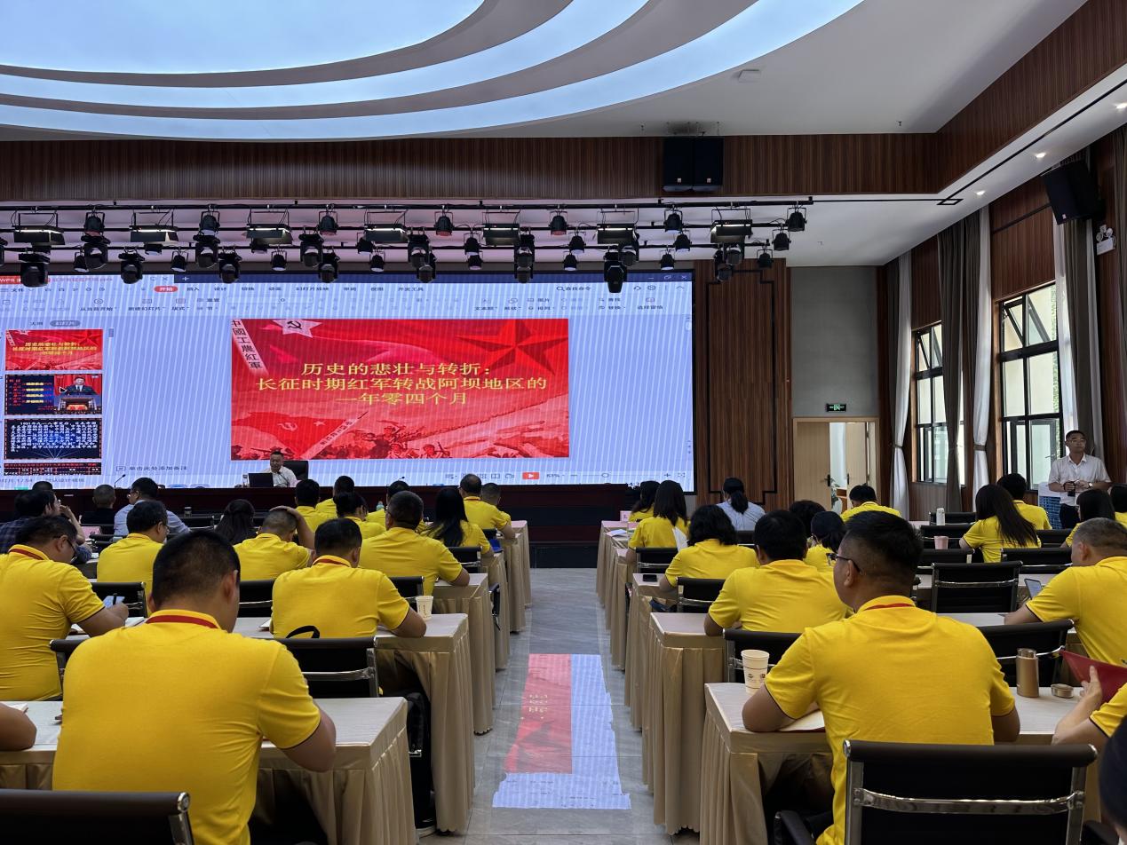 15时,李元春老师以“历史的悲壮与转折——长征时期红军转战阿坝地区的一年零四个月”为题,通过讲解松潘战役、夏洮战役、绥崇丹懋战役等几场发生在阿坝地区的重要战役,展现红军在阿坝地区浴血奋战,谱写红军在极度艰苦情况下革命斗争的壮丽篇章,对提升班成员进行红军抛头颅洒热血革命斗争的专题辅导。