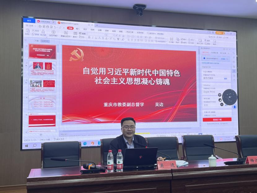 吴边教授强调,要自觉用习近平新时代中国特色社会主义思想凝心铸魂,需要在三个方面下功夫。一是在深化上下功夫,切实做到政治自觉。习近平新时代中国特色社会主义思想是在中国特色社会主义进入新时代的历史条件下形成的、是在科学社会主义焕发新生机、两种社会制度的较量呈现新态势的时代背景下形成的、是在百年不遇的世界大变局中形成的、是在十八大以来党所经历的深刻革命性锻造中形成的,这是时代的重大理论成果,是解决时代课题的一个重要理论支撑,这也是“为什么学”的深刻演绎。落脚到政治自觉,也就是要做到自觉把“两个确立”融入血脉、见之行动,增强“四个意识”、坚定“四个自信”、做到“两个维护”。二是在内化上下功夫,切实做到理论自觉。党的十九大郑重提出了习近平新时代中国特色社会主义思想,并把这一思想确立为我们党必须长期坚持的指导思想写入党章,实现了党的指导思想的又一次与时俱进。坚持和发展中国社会主义是习近平新时代中国特色社会主义思想的核心要义,“10个明确”是核心内容,坚定的理想信念、真挚的人民情怀、高度的自觉自信、鲜明的问题导向是理论品格,“六个必须坚持”也为深刻领悟这一科学理论提供了基本路径。在深研细读的过程中感悟思想伟力、筑牢信仰之基,做到思想“再充电”、精神“再补钙”、工作“再加油”。三是在转化上下功夫,切实做到行动自觉。党的十八大以来,对青年提出了要求,既要敢于斗争,又要善于斗争。“现在青春是用来奋斗的,将来青春是用来回忆的”,对学生而言,要做有理想、敢担当、能吃苦、肯奋斗的青年人;对教师而言,要做坚持教书和育人相统一、言传和身教相统一、潜心问道和关注社会相统一、学术自由和学术规范相统一的灵魂导师;对学院而言,要形成置身于中国式现代化宏大场景中、置身于成渝地区双城经济圈的国家战略中、置身于新时代新征程新重庆建设中的优质学院,在竞争力学院、和谐学院、幸福学院构建奋进中续写新篇章。