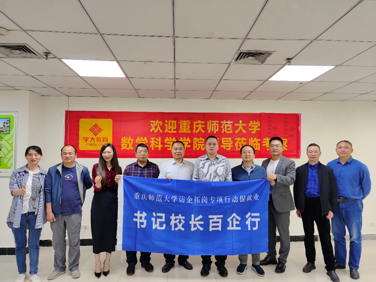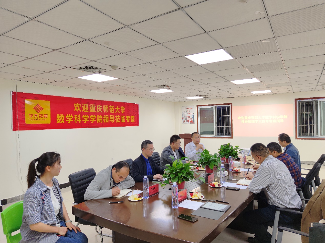 为深入开展学习贯彻习近平新时代中国特色社会主义思想主题教育,根据学院主题教育实施计划,经学校书记校长“访企拓岗”专项行动工作联系校领导曾礼书记同意,杨江水书记、杨志春院长带队于4月28日走访学大教育科技集团重庆分公司、重庆芝诺大数据有限公司,袁小于副书记、赵克全副院长、应用数学系主任周寿明教授、工会主席、运筹与统计系副主任王洪春教授随同考察。
