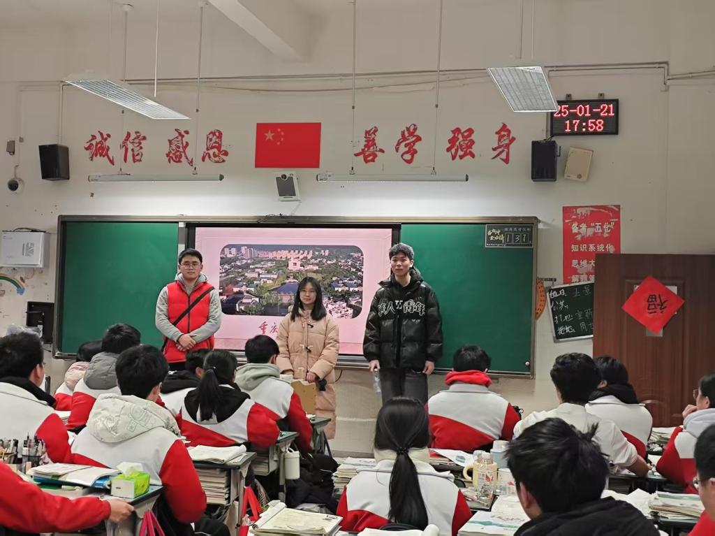2024级数学与应用数学(师范)的贺凯杰同学回到高中母校——重庆石柱回龙中学开展“学长助力高考”主题宣讲。他通过讲解精心制作的PPT,系统展示了校园环境、数学专业特色及招生政策,并结合自身高考逆袭案例解析备考策略。他表示:在活动现场自己特意设置了“解压呼吸操”互动环节,并为学弟学妹发放了“高考小贴士”,希望为他们的高考之路增添信心与力量。