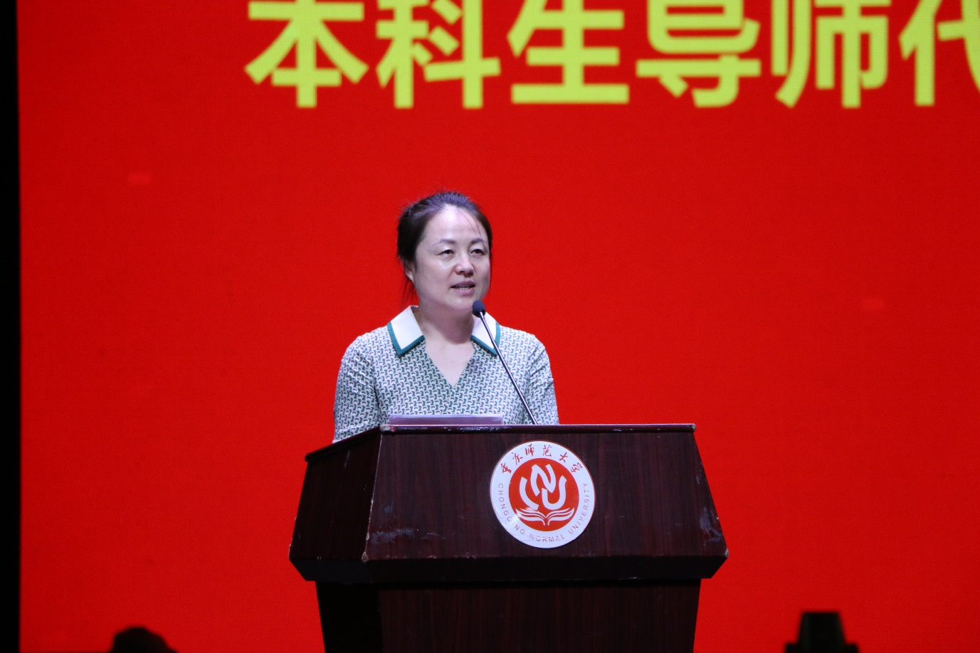 本科生导师代表张春霞教授发言,寄语毕业生要“持之以恒, 发扬终身学习精神,以责任为担当,勤于进取,博学笃行,勇往直前,做善良感恩的人”。