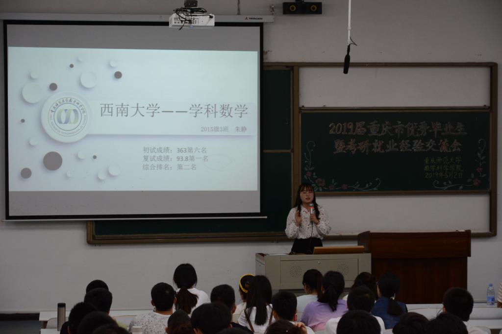 然后,数学与应用数学专业的朱静同学讲述了她考研至西南大学学科数学的奋斗经历。面对西南大学这几年都没招生过的专业,为了心中的教师梦,她依然砥砺前行!从各种途径搜集资料,用理解的方法构架框架,关注当年的教育热点等,这些都是她考研成功的秘诀。