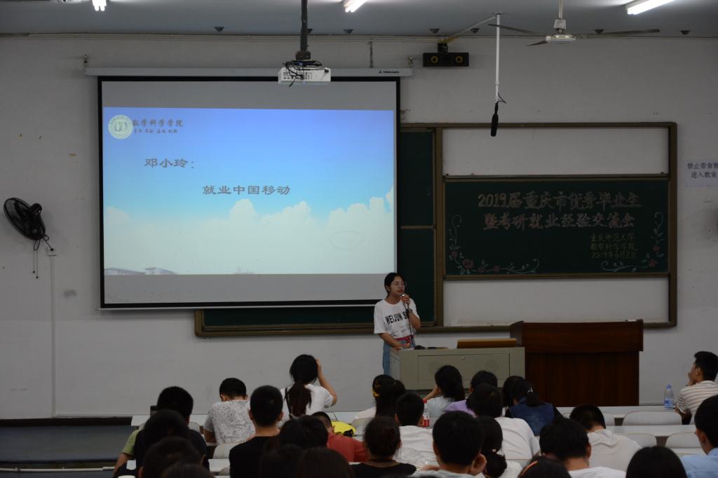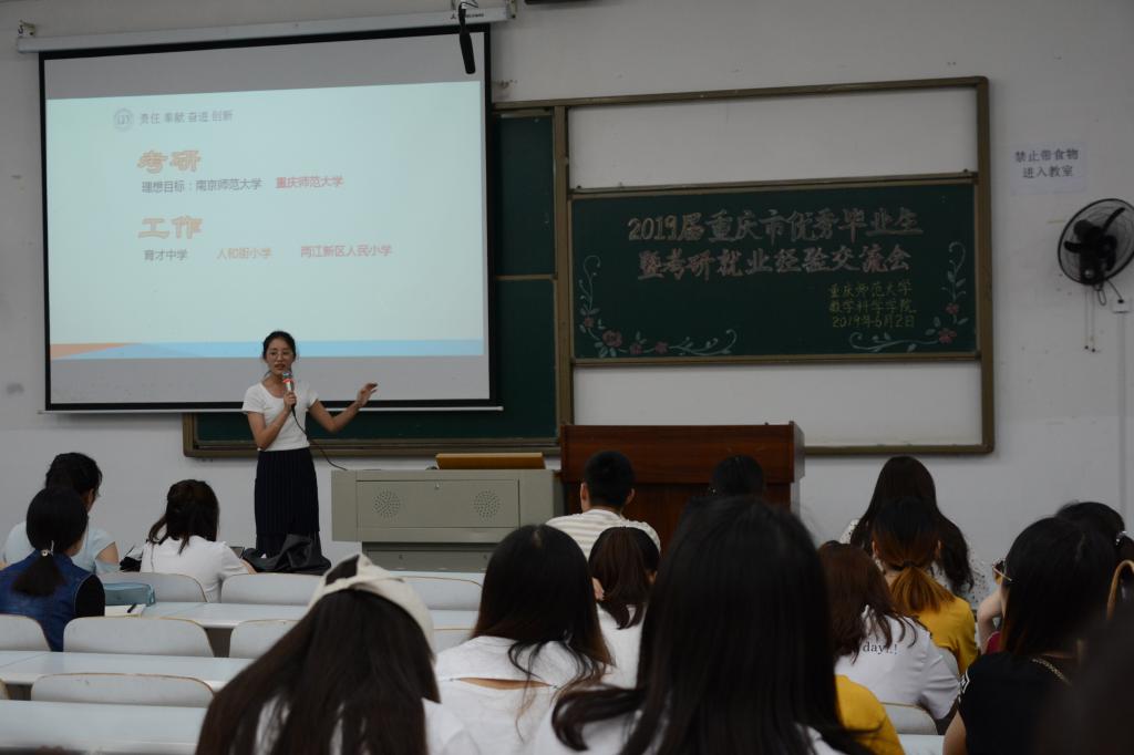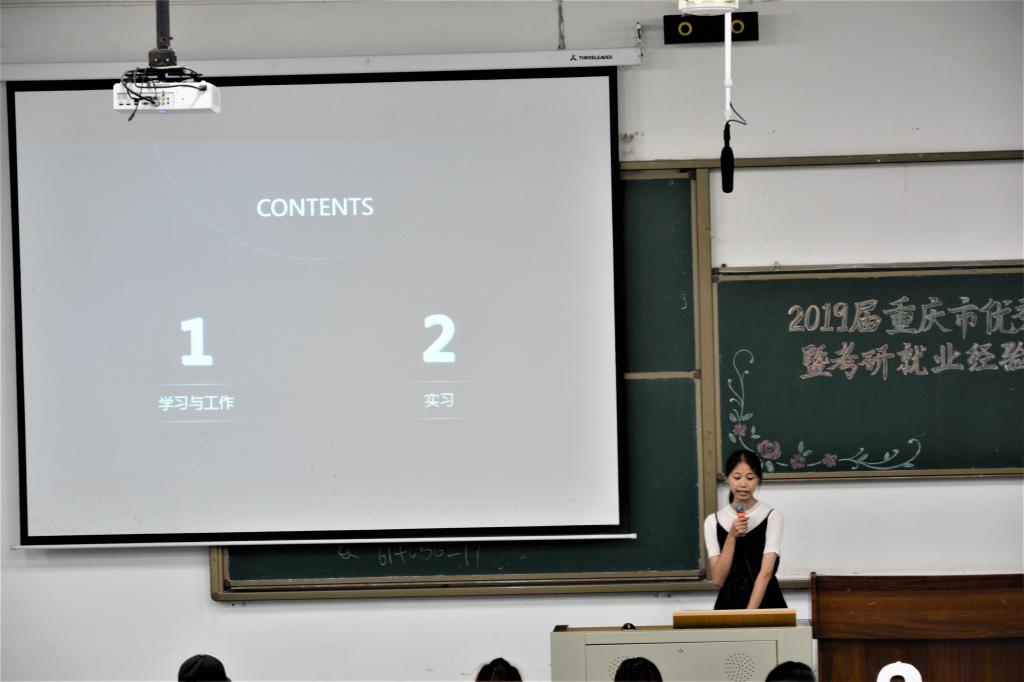 首先,2019届重庆市优秀大学毕业生获得者,来自数学与应用数学专业的程敏同学为大家讲述了她是如何平衡考研与工作。她采取两头掐的方法,在备战考研的前几月和最后几个月她都细心学习,而在中间几个月她她又积极准备工作面试,最终获得考研和工作的双丰收。她告诉同学们一定要懂得取舍,定好自己的目标,并为这个目标一直努力,一往无前。