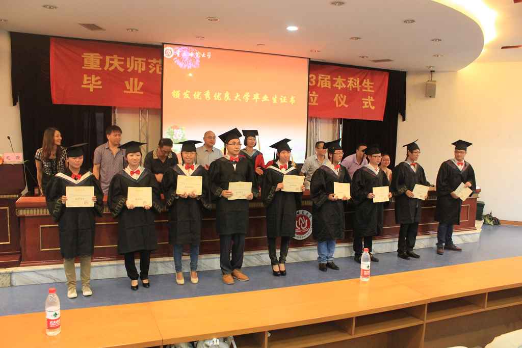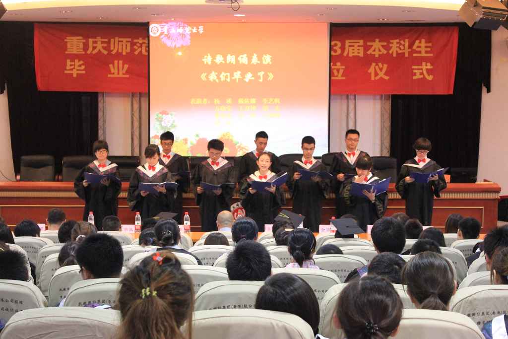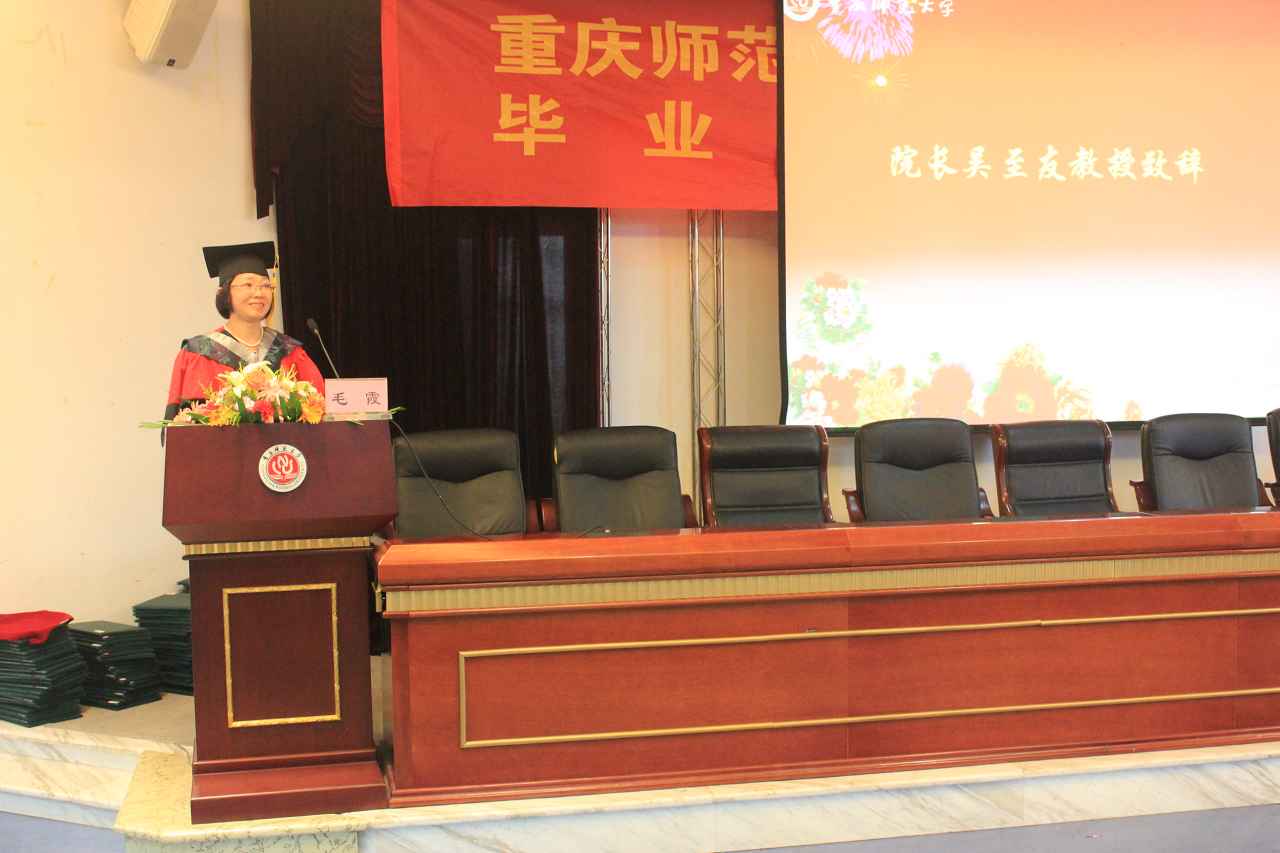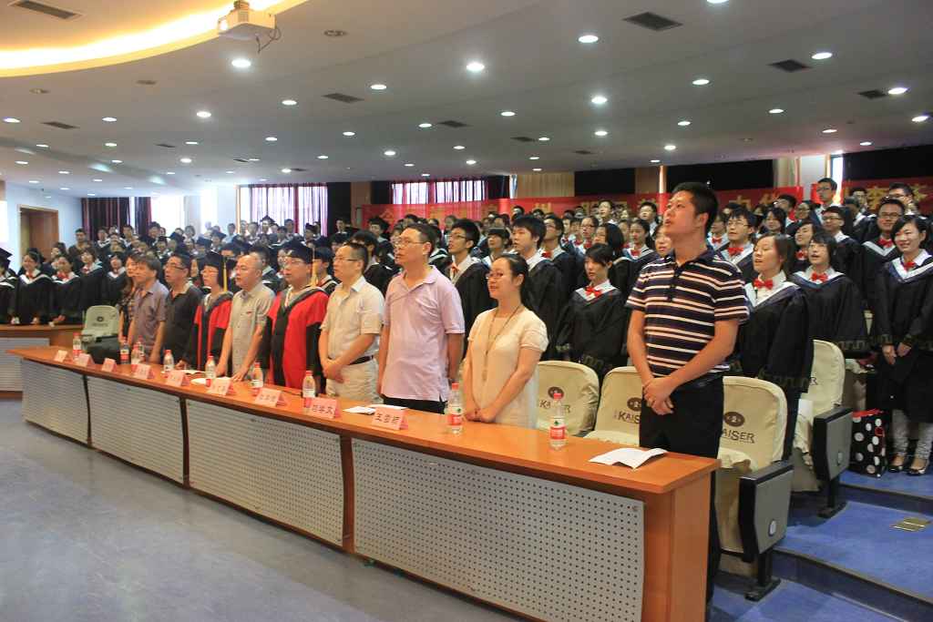 带着梦想与不舍,带着感恩与兴奋,毕业典礼伴随着国歌,缓缓的拉开序幕。赤、橙、黄、绿、青、蓝、紫七彩的大学生活《毕业色》毕业专题片将全体师生回顾了四年的大学生活,仿佛从走青春路,只是,这一刻,五味杂成。然后由我院院长吴至友教授致辞,在衷心的祝贺他们的同时也深表感谢同学们四年来为学院争得的荣誉,并希望全体毕业生要爱岗敬业,与时俱进;勤奋学习,勇于创新;感恩父母,感恩母校,感恩祖国。教师代表罗萍老师寄语他们怀宽容、仁爱之心,面对挫折,勇于挑战。毕业生代表徐赟同学发言,蕴含了他对学院的感恩与祝福。紧接着毕业生对李鑫老师改编诗歌《我们毕业了》进行了配乐朗诵,字字言出不舍,感人肺腑。紧接着何大海书记宣读校级优秀优良毕业生表彰决定。最后在一片温馨的乐曲声中举行了隆重的授位仪式,吴至友院长和杨志春副院长为每位学子举颁发学位证书,整理头顶流苏,典礼气氛达到高潮。