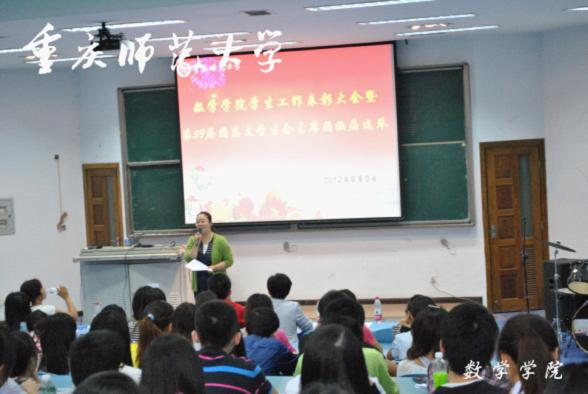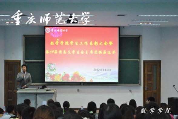 2012年6月3日14:30,数学学院2011—2012年度太阳集团总结表彰暨第59届团总支学生会主席团换届选举大会在弘德楼5205隆重举行。数学学院分党委副书记毛霞老师、校研究生处培养与管理科副科长曾庆芳老师、外国语学院孟继东老师及我院各年级辅导员老师和第57届学生书记隆小霞、主席付科程、主席团成员刘强莅临大会。大会由团总支副书记李鑫老师主持。