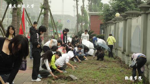 虽然天空飘着绵绵细雨,但同学们的热情丝毫未减。大家拿着铁锹、扫帚、铲子,如火如荼地干起来。拔草、扫地、清理垃圾,认认真真,一丝不苟,没有一点怠慢。泥土夹杂着雨水,给大家的工作带来了一定困难。很多同学的头发被雨水完全淋湿,衣服沾满泥浆,但大家并没有在乎这些,反而干劲十足,圆满完成任务。