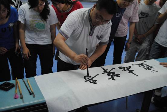 活动伊始,柏仕坤老师用幽默风趣的语言进行了简短的自我介绍。他声音洪亮,充满激情和活力的话语感染了在场的每一位同学。接着,柏老师从握笔姿势、运笔、基本笔画、字的结构和布局等方面对如何写好“三笔字”进行了系统的讲解。柏老师强调,练习毛笔字是写得一手好字的基础,它可以锻炼我们对汉字结构的把握,对写好钢笔字、粉笔字都有积极的作用。最后,柏老师以身示范,他用毛笔书写行书、楷书、隶书等不同风格的字体,向大家展示他的书法风采,那铁画银钩的书法博得同学们的阵阵掌声。