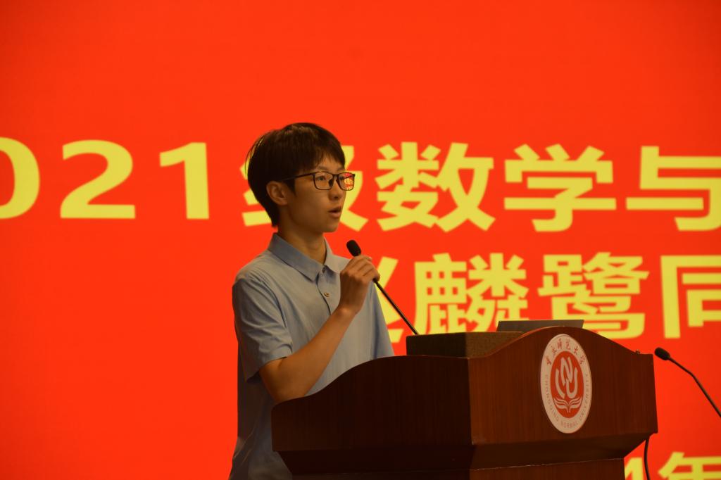 奏唱国歌后,2021级数学与应用数学专业赵麟鹭同学代表高年级学生发言,热烈欢迎2024级新同学加入太阳集团tcy8722这个充满激情和梦想之地。他介绍了自己大学三年的学习经历和所取得的优异成绩,并分享了三点体会:一是认识自己,做好规划,目标明确方能让大学生活更加充实而精彩;二是摆脱懒惰,坚持学习,兼备求知的深度与广度才能收获更多;三是参与实践,创造价值,积极打破局限努力提升综合素质。他鼓励新生以乐观、包容、感恩的心态面对大学生活,共同书写新的篇章,并祝愿大家向上向善,收获真知,成长顺利,学院未来更加辉煌。