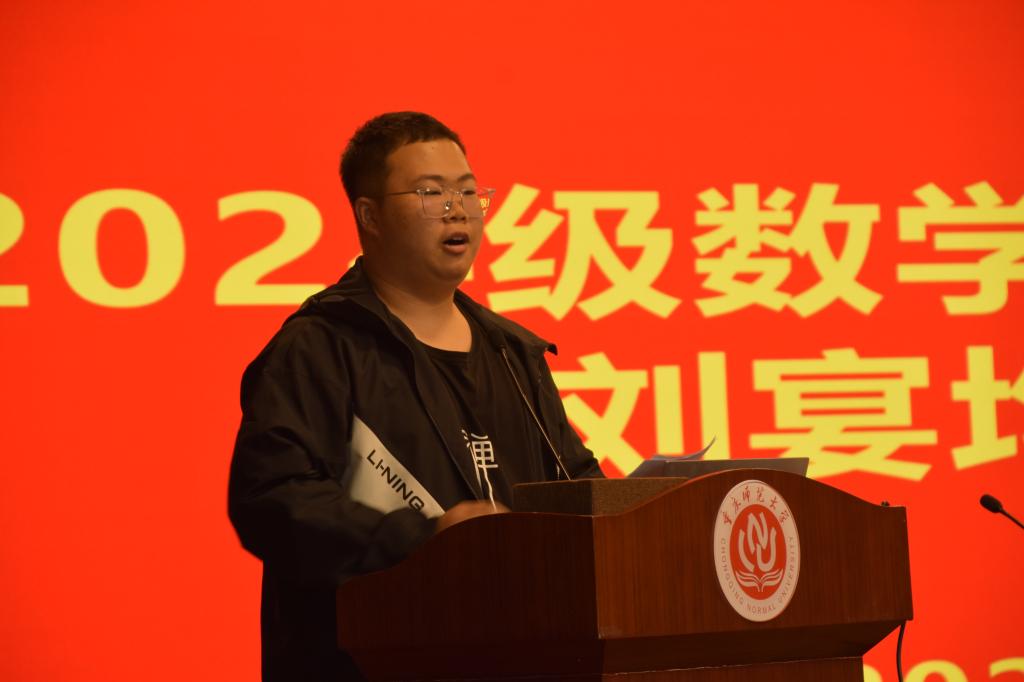 2024级数学与应用数学专业刘宴均同学代表新生发言,表达了对未来的憧憬和成为优秀数学人的决心。他表示将认真对待每一门课程,扎实掌握数学理论和方法,培养自己的逻辑思维能力和解决问题的能力;会积极锻炼自己的教育教学能力,提高综合素质,培养有益的兴趣爱好,保持积极向上的心态;要立志成为一名优秀的数学教师、一名知识渊博的人、有爱心和责任心的人、有创新意识的人。他还号召大家一起努力,用汗水浇灌梦想,用奋斗书写青春!