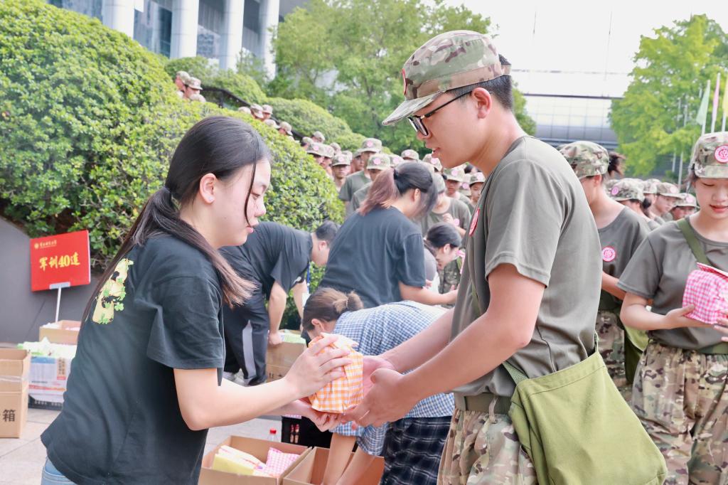 随后,学生会成员将一份份满载心意的慰问品递到新生手中。同学们笑容灿烂,“谢谢”声与欢笑声此起彼伏,暖流在方阵间悄然传递。