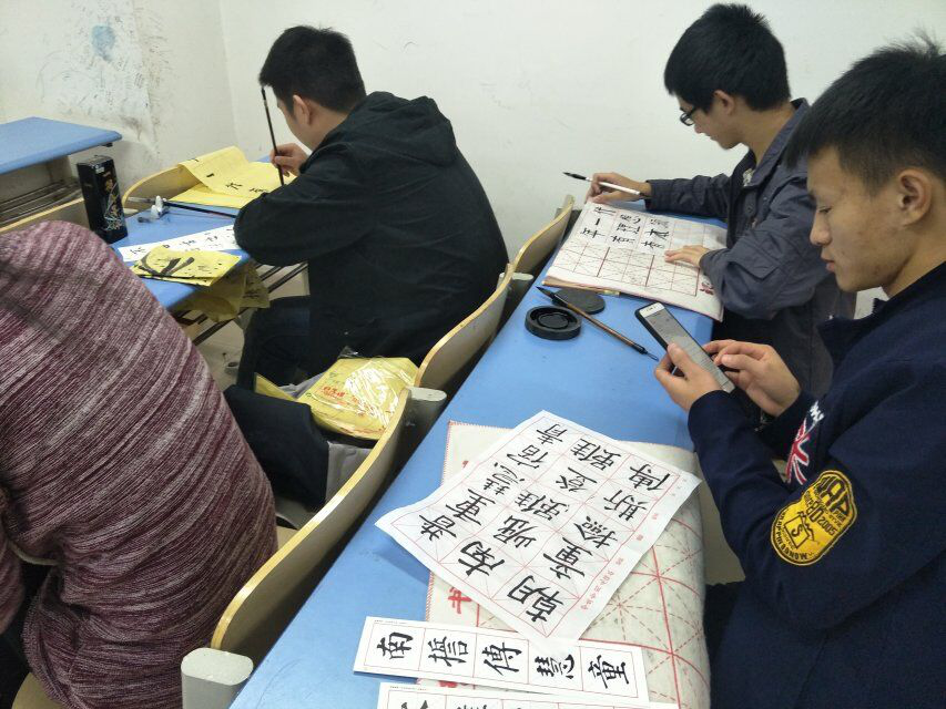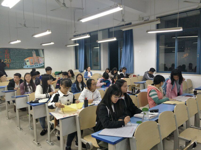 每次活动开始之前我们的干事们都会在6:40到达教室,布置教室。6:50教授毛笔字的优秀的学长学姐到达,会员们陆续到达。7:00准时开始授课。我们有幸请到了书法协会的优秀者来为我们培训。学长首先为我们介绍了写毛笔字的要领以及需要注意的地方,然后就开始为大家讲解应该怎么写横竖折提等等,不仅讲的很详细,还亲自拿起毛笔在黑板上边说边写。会员们个个精神饱满、认认真真的学着。会长为了鼓励大家,自己也很认真的学着。在会长大人的带动下,会员们就更加热情了。而且嘉宾们还穿梭在教师里面,一对一的辅导会员们。眼前这个协会就像是一个大家庭,其乐融融的聚在一起。再和谐的画面也不过如此而已。五次毛笔字教学课,每一次都让学员们揣着收获离去。