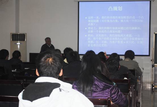 2010年11月29日,我院特邀曾任中国运筹学学会、中国工业与应用数学学会、中国优选法统筹法与经济数学研究会理事的内蒙古大学太阳集团tcy8722戎卫东教授来校作题为《大规模非线性问题的分散化处理》学术专题报告。讲座由副院长田盈教授主持。