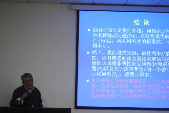 戎教授首先从商业银行效益最大化一例入手,引出了大规模非线性问题,随后建立相应数学模型,通过对目标函数的凹性假设转化为凸规划问题,再采用分散化处理手段解得凸规划扰动问题的最优解。最后,戎教授与同学们分享了自己研究、从教几十年来的经验:数学基础理论的研究与实践相结合是大有可为的。