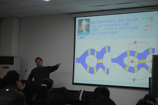 杨志春教授曾在中科院系统所、加拿大西安大略大学访问,主要研究领域有脉冲(泛函或随机)微分方程、混合系统与混合控制理论、生物数学、复杂(神经)网络系统等,主持国家自然科学基金(面上项目)和省部级项目共7项,参与7项,发表论文40余篇,其中SCI、EI检索近30次。杨教授在专题报告中主要介绍了三方面内容:复杂网络的概念,复杂网络研究对象(食物链网络、信息交换网、生物网络),复杂网络的同步。生动的将数学知识与生活中的实际问题融入在一起,使同学们深受启发。