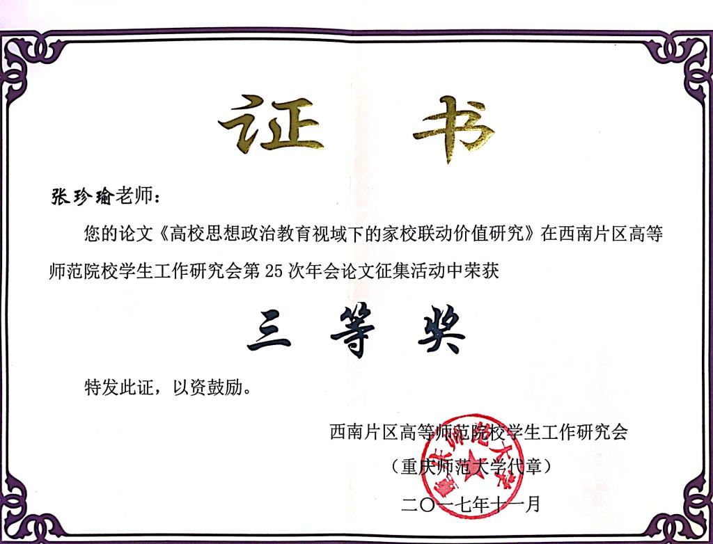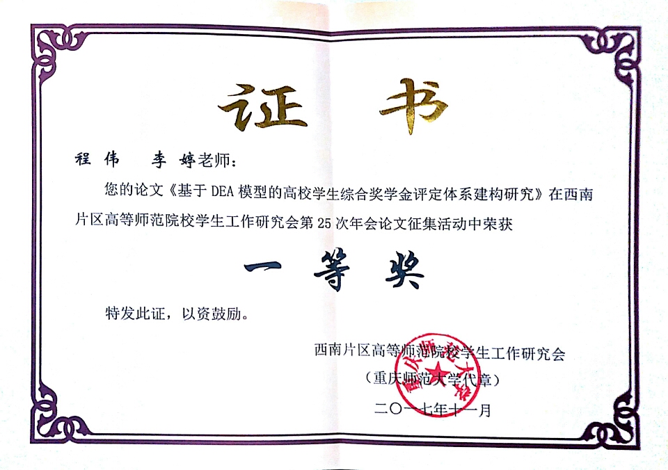 在西南片区高等师范院校太阳集团研究会第25次年会征文征集活动中,程伟老师名为《基于DEA模型的高校学生综合奖学金评定体系建构研究》的论文荣获一等奖,张珍瑜老师名为《高校思想政治教育视域下的家校联动价值研究》的论文荣获三等奖。